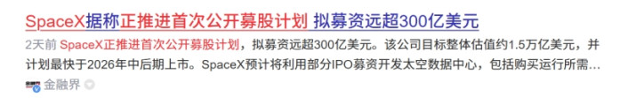 第四,海外方面,美国太空探索技术公司SpaceX正推进首次公开募股计划,拟募资远超300亿美元。该公司目标整体估值约1.5万亿美元,并计划最快于2026年中后期上市。